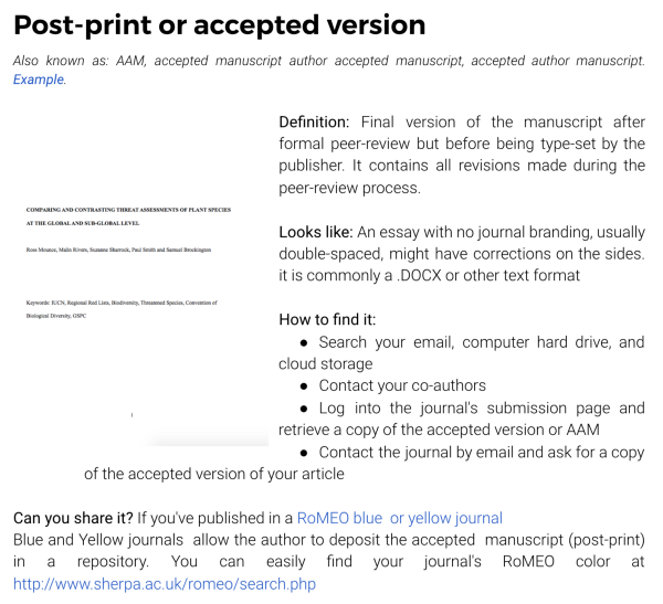 Direct2AAM forms an important part of the Open Access Button’s efforts to dramatically increase self-archiving rates, and the guides build on lessons learned running the our request system. Through the request system, we systematically and rigorously test both novel and not so novel strategies for encouraging authors to self-archive. While doing this, we’ve seen first hand just how many authors struggle to find the right copies to archive, and we know from collaborations with the repository community that we’re not alone. These guides complement our “Article Version Explainer” resource which outlines, with simple explanations and images, the difference between key article versions for self-archiving.