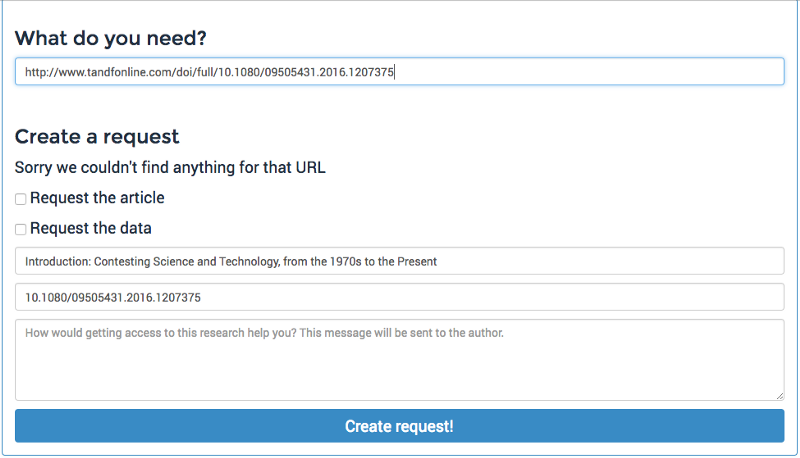 We’ve designed a transparent and effective request system to help make more research accessible. Originally the Button recorded when users were blocked from getting access to research — now all of those paywall blocks will be transformed into requests. What this means is that we’ll be contacting the author of the article and requesting they make the article accessible. Requests are now editable by the community, which will provide valuable information such as updated author contact information. We hope these requests will help authors adopt Open Access archiving and that we’ll be able to instantly provide access to you in the future. Although we’ve got quite the backlog to work through, we’ll be trying to process new requests within 24 hours after Open Access Week.